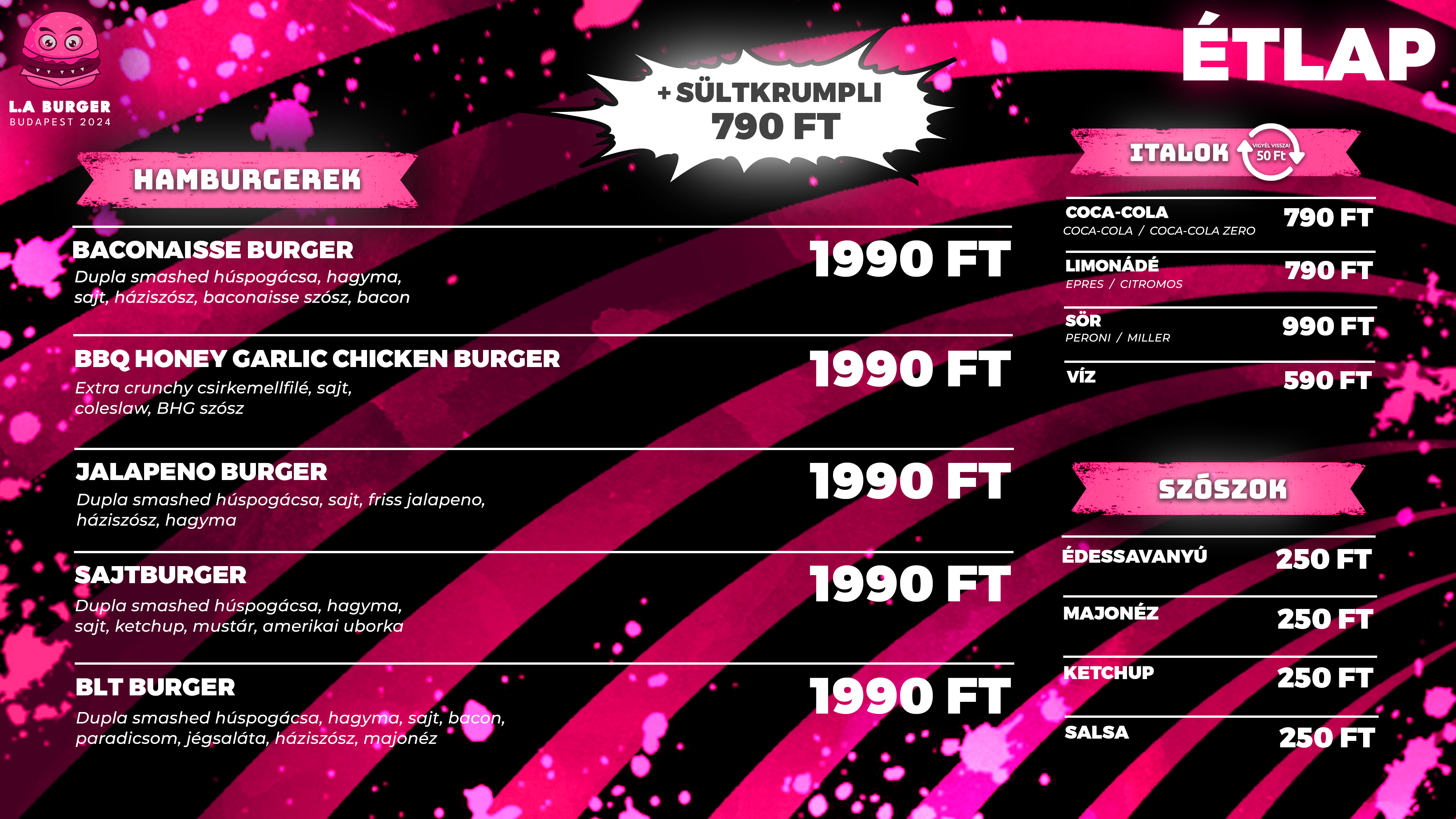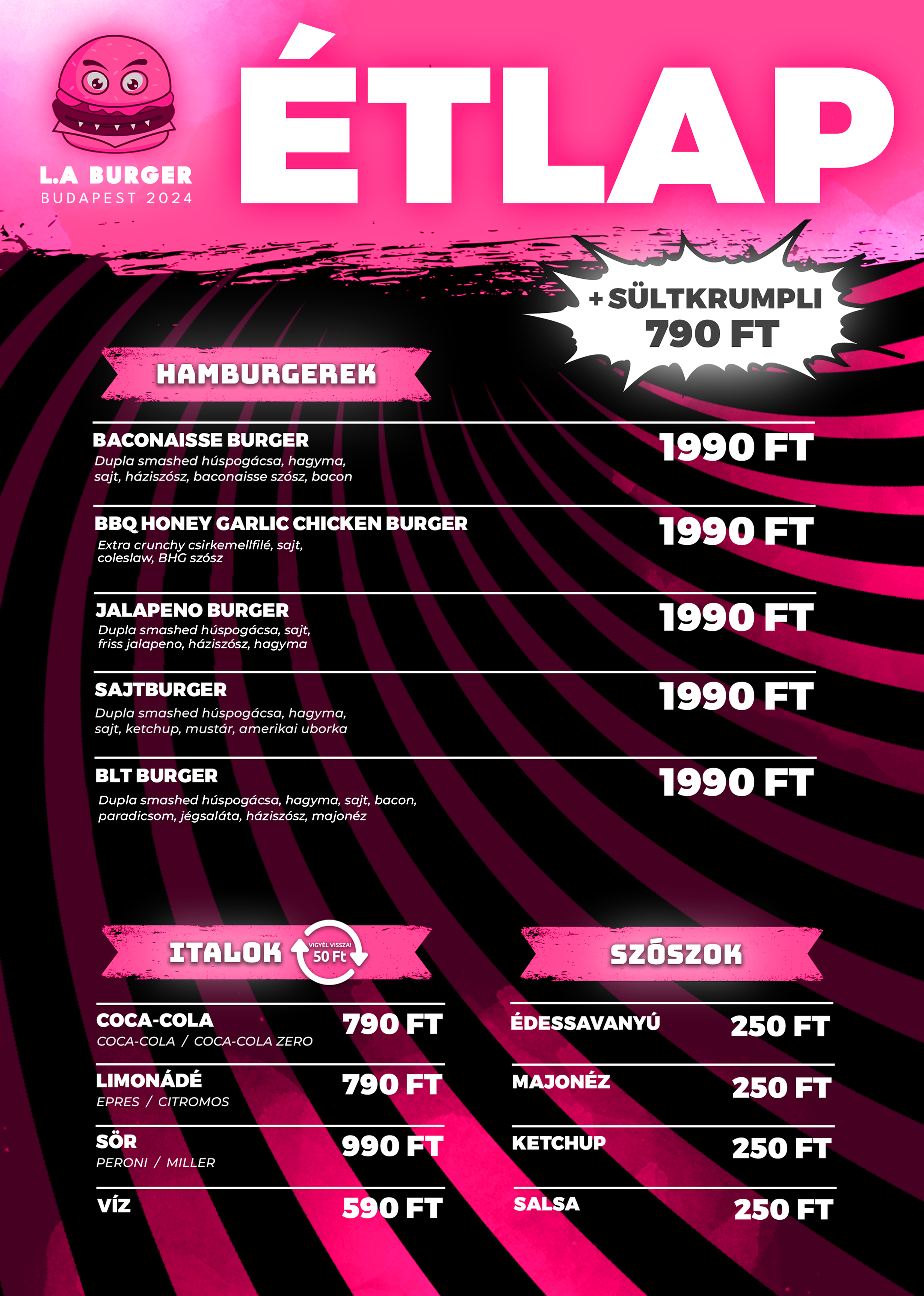 Az LA Burger egész hasonló koncepciót képvisel, mint a többi burgerező: a kínálat nagyon egyszerű, csak négy marhás és egy csirkés burger szerepel az állandó kínálatban.